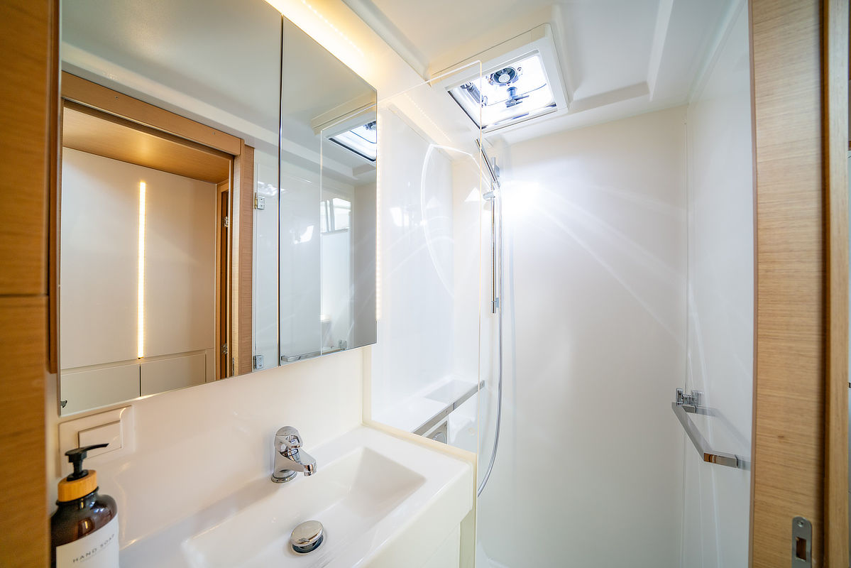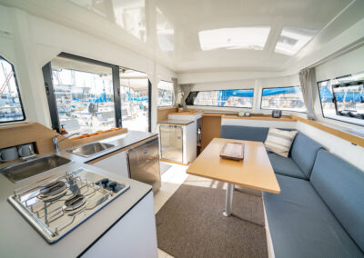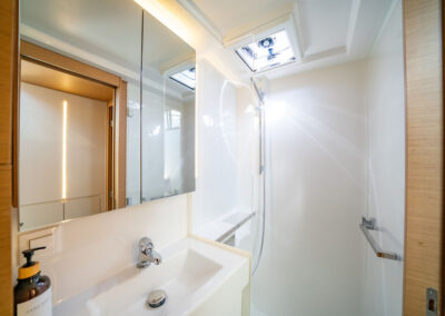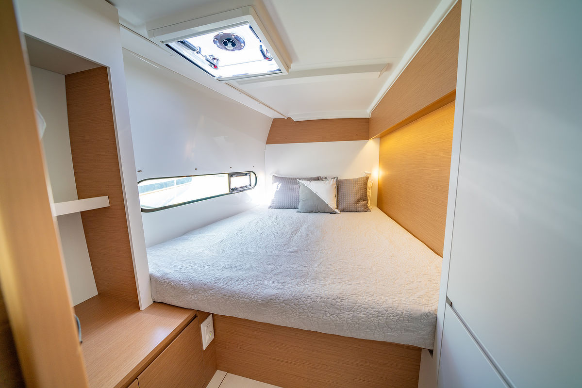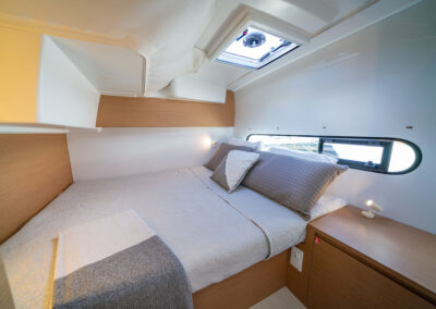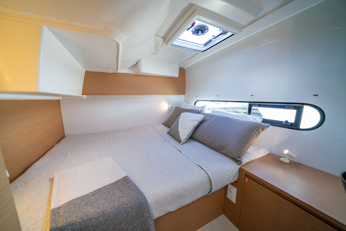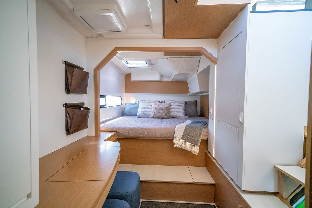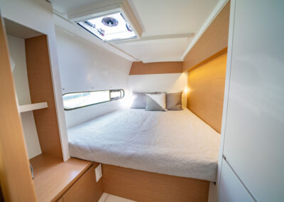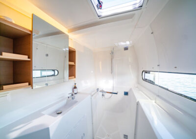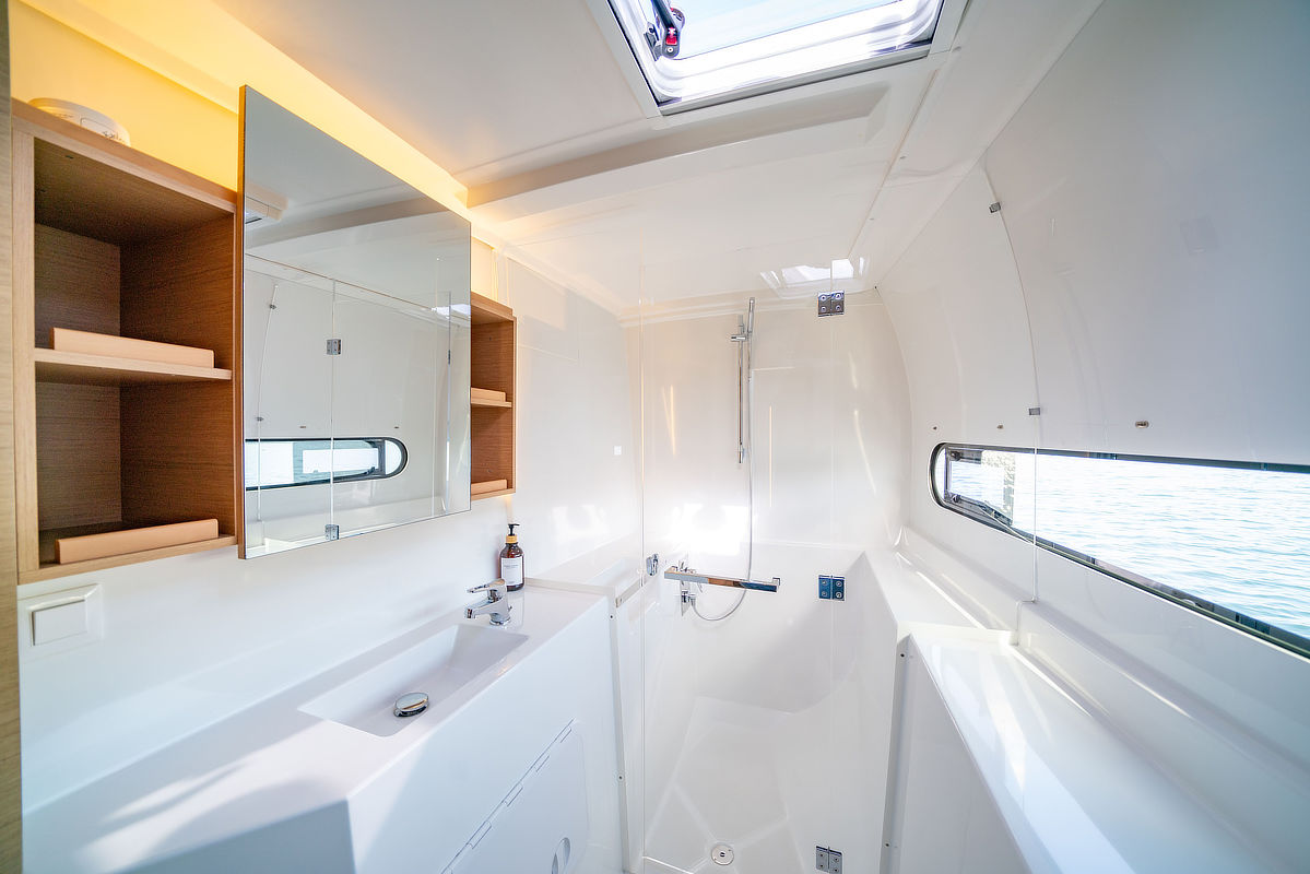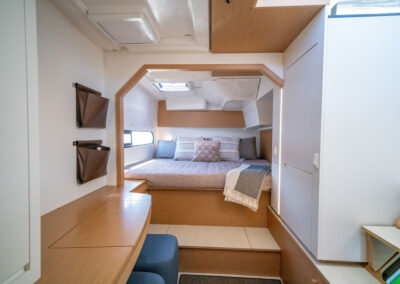 Excess 11 has benefited from the experience of her elders, without sacrificing all the comfort attributes needed for enjoyable cruising. Add to this a volume worthy of a larger boat, whether in the saloon or in the cabins, with for example a 2 by 2-meter (6½’x6½’) bed in the owner’s cabin or bathrooms with separate showers! On deck, she offers the comfort and friendliness of a large open cockpit and twin helm stations, offering both real steering sensations and direct contact with the rest of the crew.